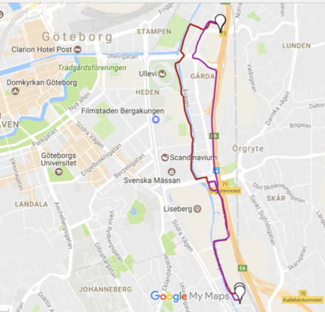 The electric cargo bike and the van drove five different routes (in total 12,7 km) in Gothenburg, three times each, between 17-22 March 2017. These routes are actual routes ridden by Pling Transport on a daily basis: